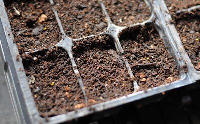 Small, pelleted seeds pressed in the soil