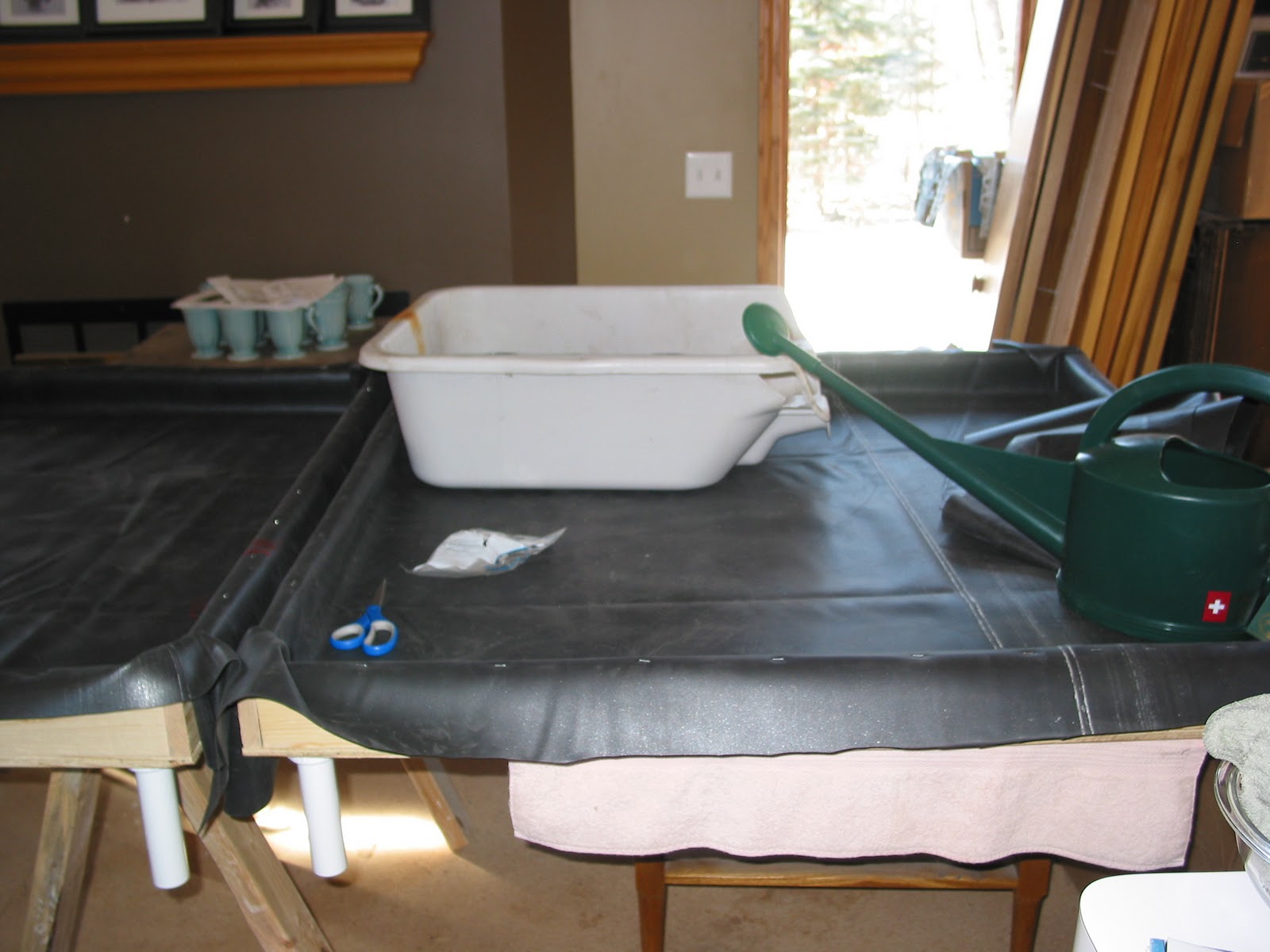 Two trays set up on saw horses. I purchased seed trays in bulk.
